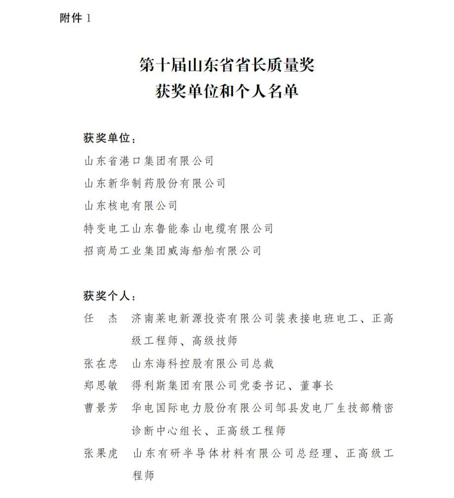 11月20日,山东省人民政府网站对外发布《山东省人民政府关于表彰第十届山东省省长质量奖及提名奖获奖单位和个人的通报》。
